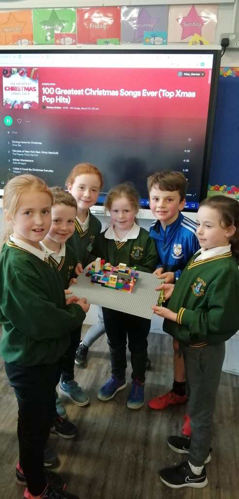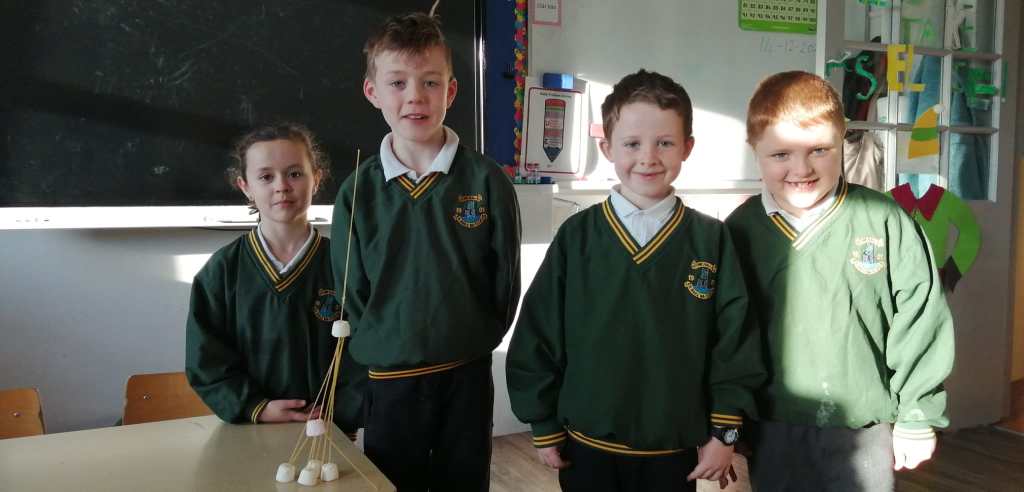 The children in first and second class worked very hard on their part in this project. They were very enthusiastic and learned a lot through their many activities. They initially explored the features of a typical castle and the reasons for many of those; a drawbridge, circular stairs, windows – types and style, thick stone walls etc. The discussed why these different features were important and in particular the castles were means of protection for families. They discussed castles in the locality and expanded this to the entire parish. They discovered many new castles they were not aware of.