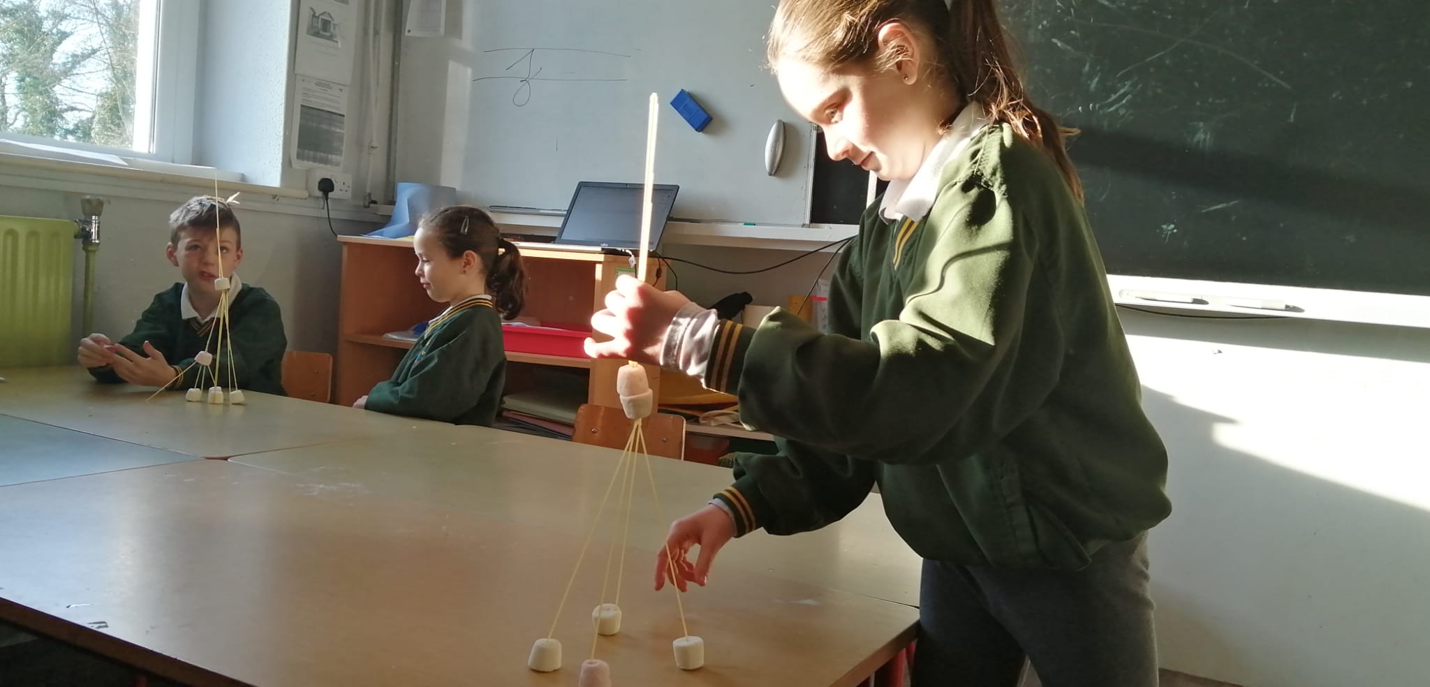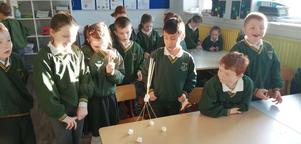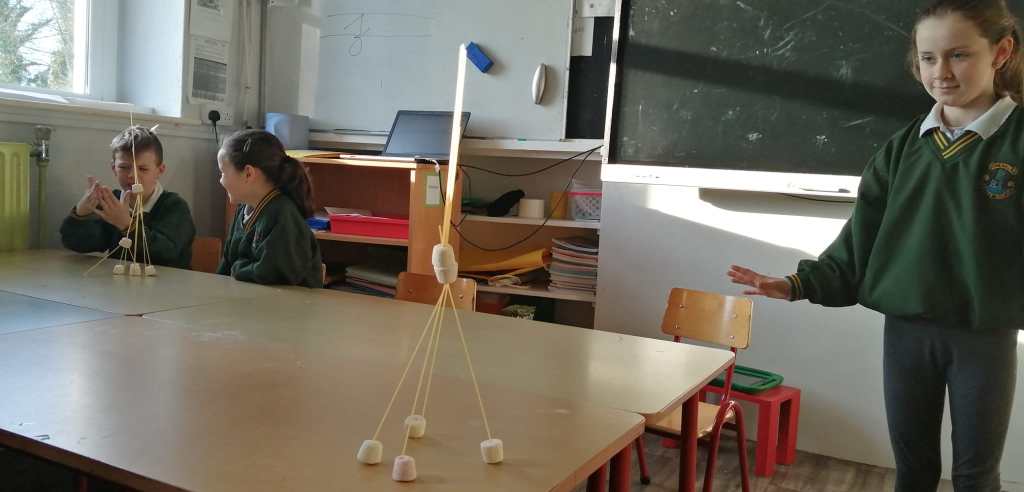 They did an art activity where they drew castles while specifically focusing on certain features of the castles as well as the symmetry of castles. They then moved onto 3D constructions of castles using spaghetti and marshmallows, they discovered many important factors for making solid constructions, particularly around creating good foundations. They continued with this discovery learning style with construction of castles using lego and also playing cards.