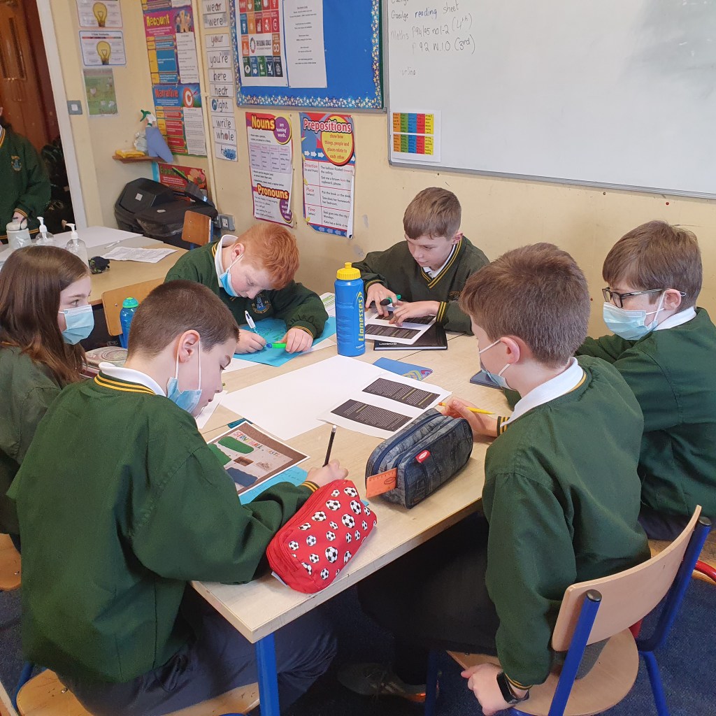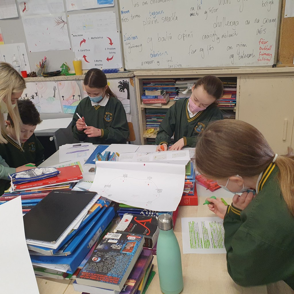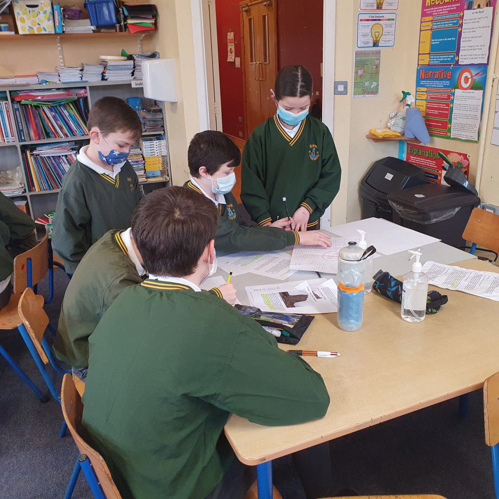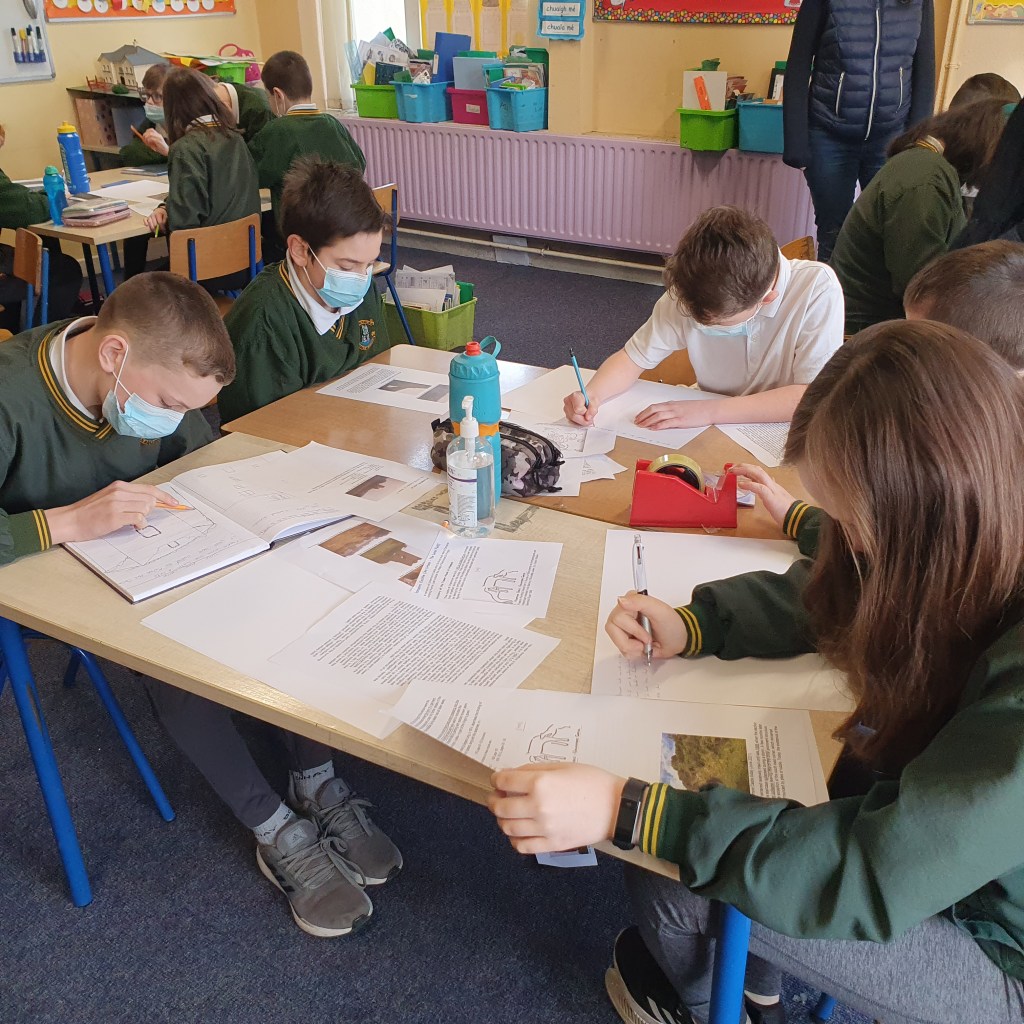 They then presented this back to everyone. We were lucky to have Mr. Colm Liddy come and then work with each group. He spoke with them about their research, created many discussion points and showed lots of photographs of the current state of some of the castles. It was an excellent opportunity for the class to talk to a local historian and get his advice on it. Colm also helped the children to pinpoint each castle on a map of the parish.