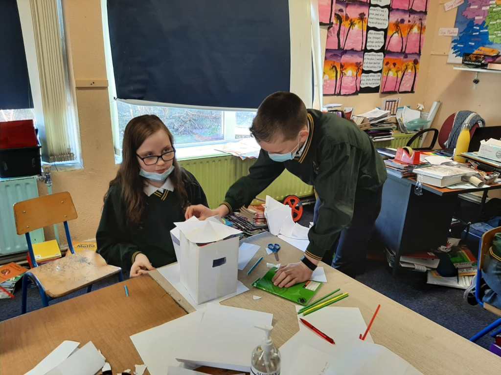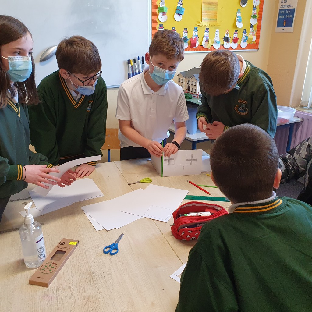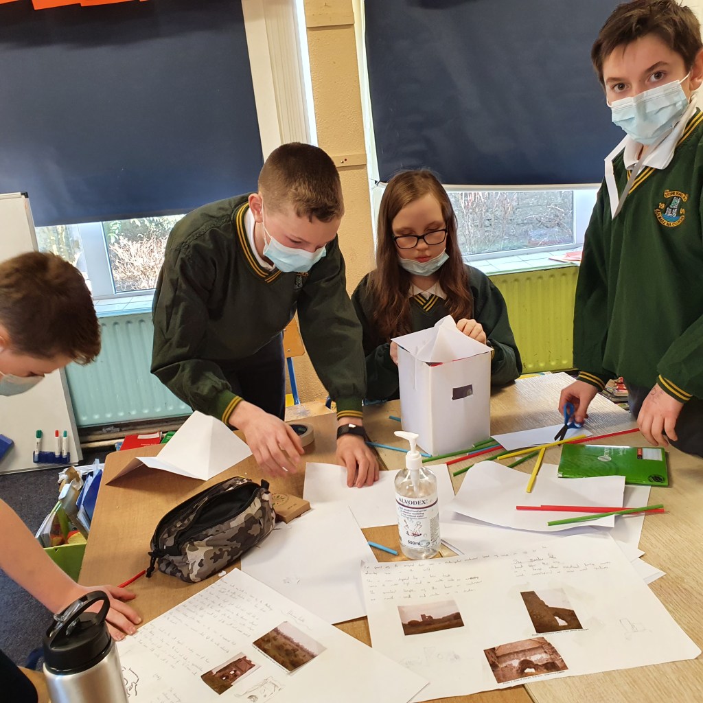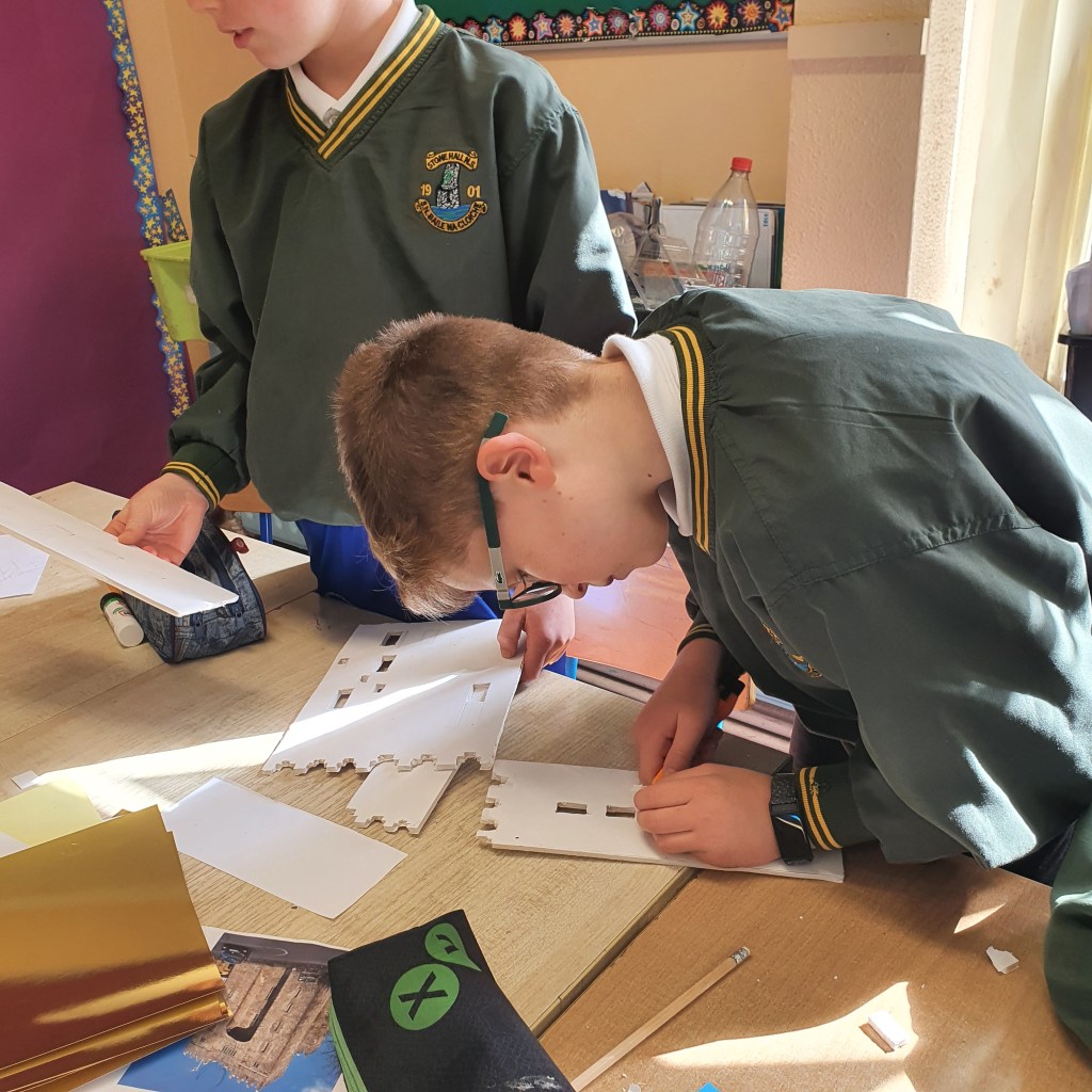 We talked about the significant features on the five castles we chose to make. We spoke about how we would make 3D versions of them. We decided to use a foam card to make the constructions. We found measurements of the walls of the castles from historical sketches. We used these to create scaled sketches for the constructions. We used a scale of 1m:1.5cm. After all the maths were done the classes set about drawing the sketches directed to the card and carving the pieces out with craft knives. This was a slow task in order to get a precise result, especially taking into account area as of the walls which have fallen or broken in parts. Once the walls were cut out, they were glued together. Finally each castle was sprayed with both a grey paint and also a graphite spray to give the texture and ‘stone’ look.