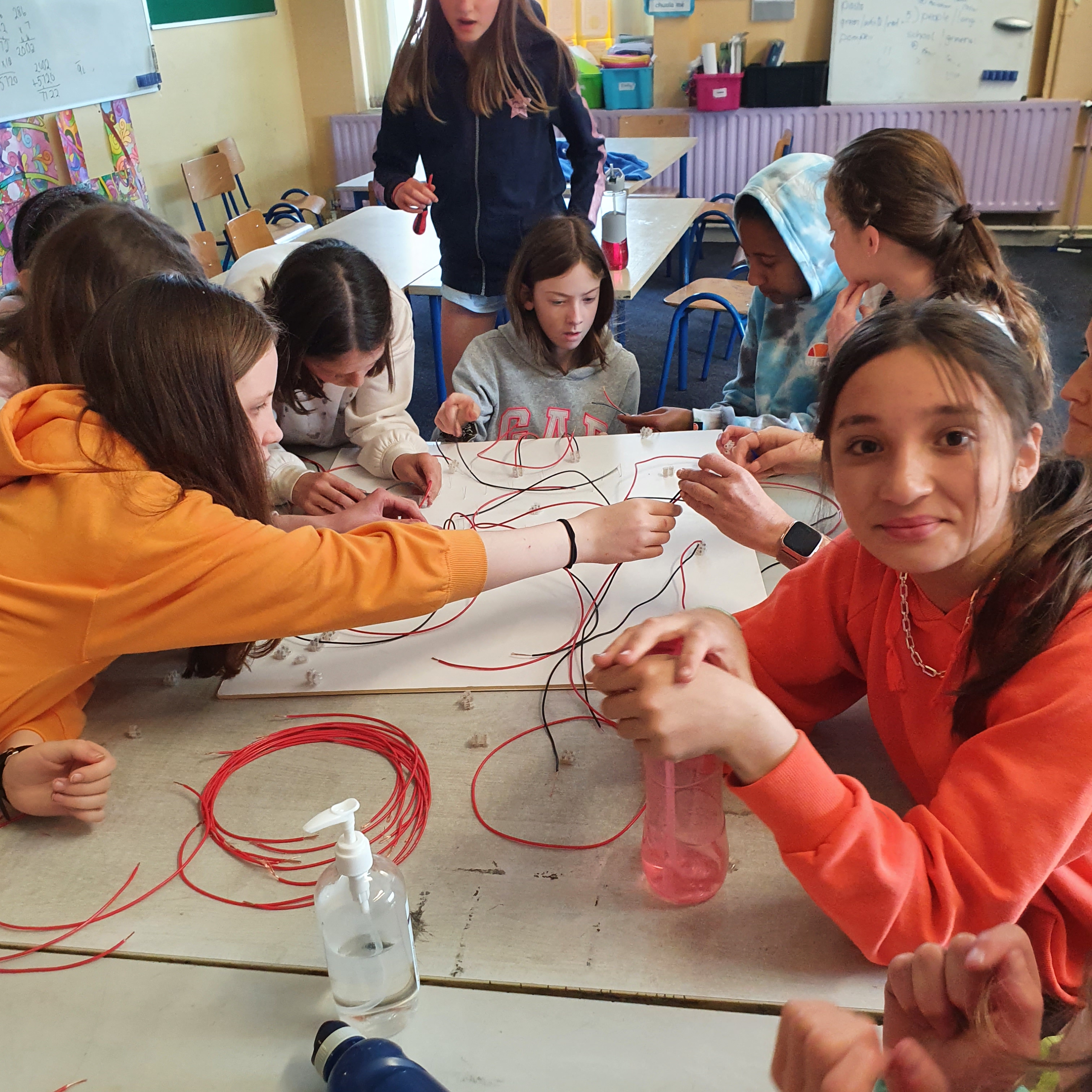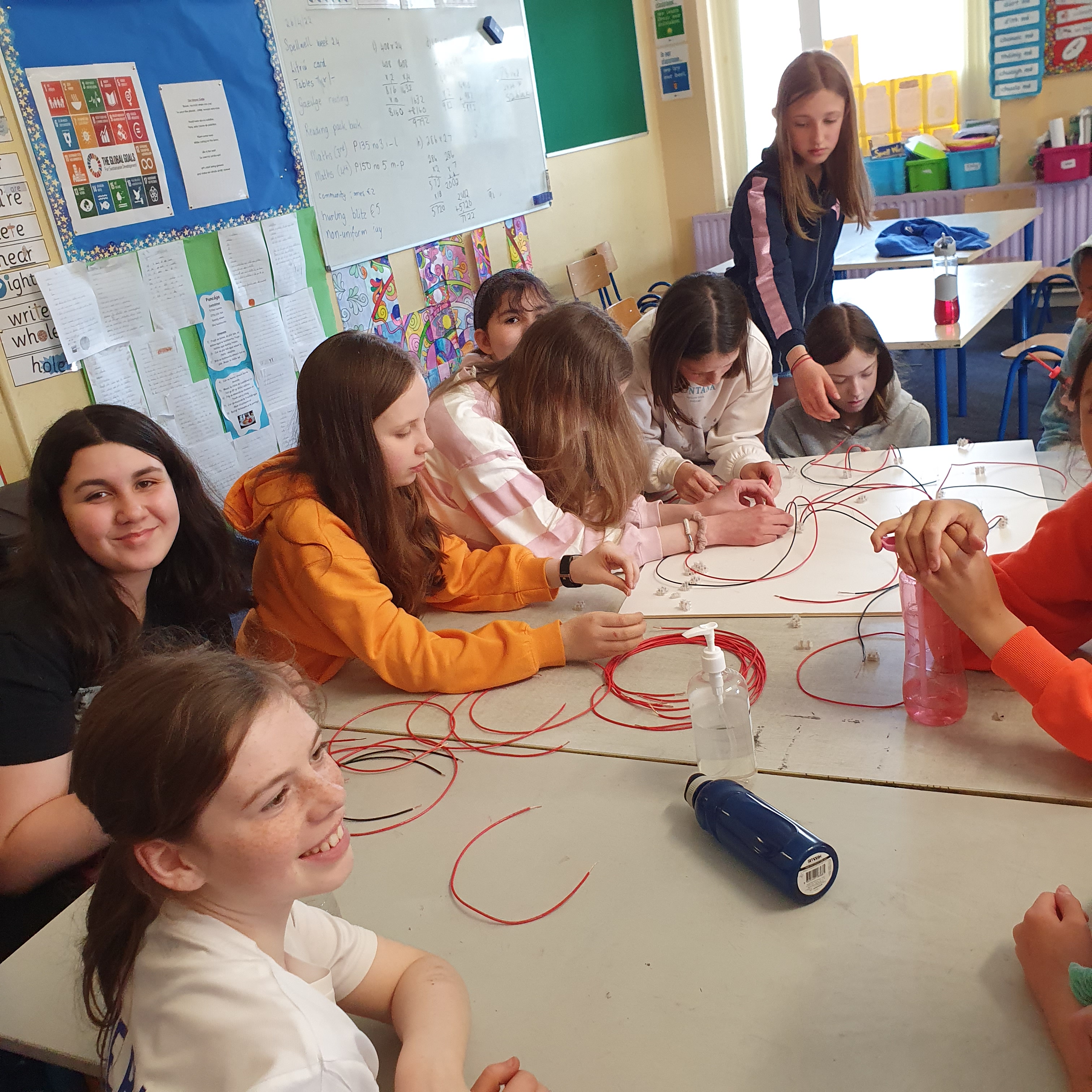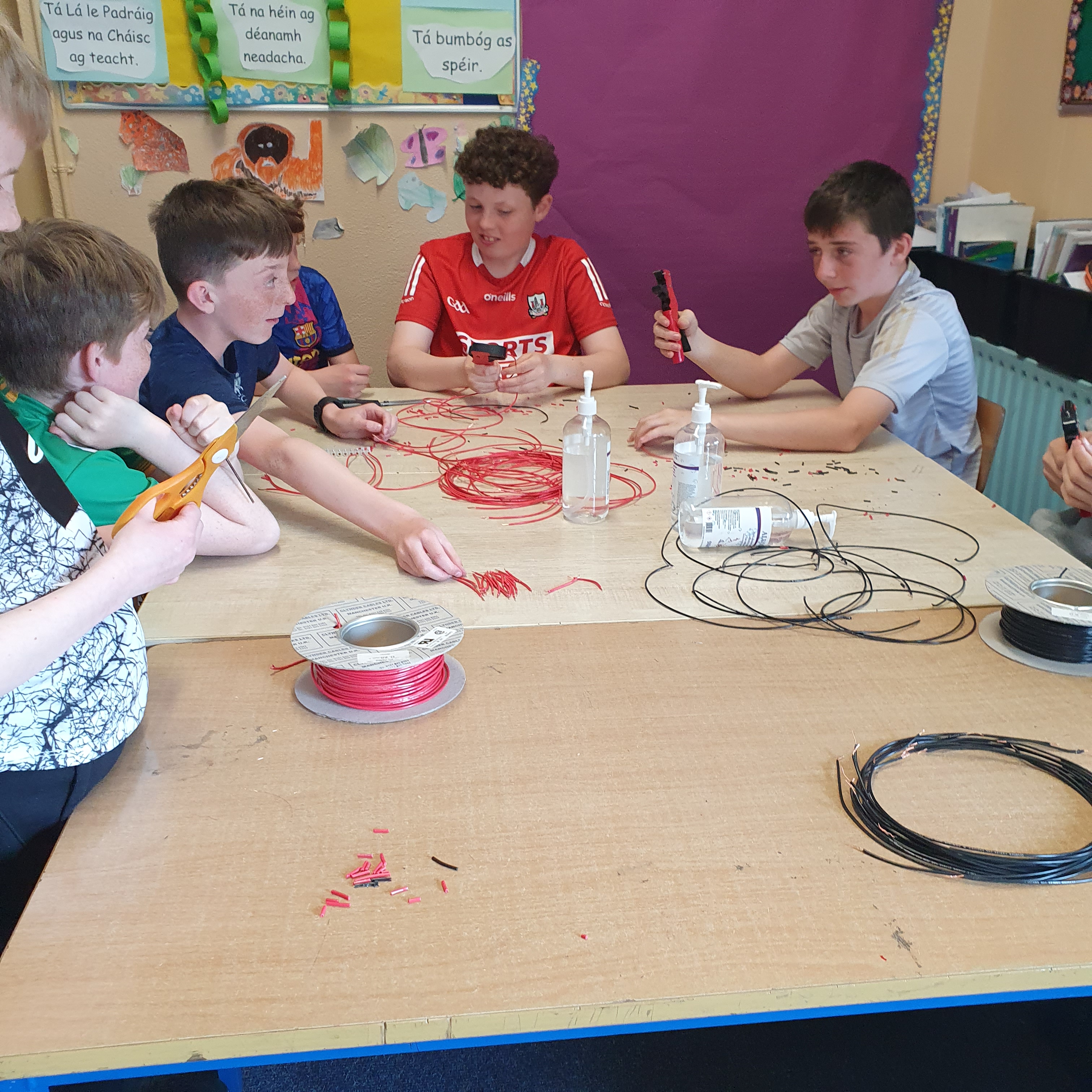 We learned about circuits, moving from simple circuits using a bulb and a battery to including a switch. We then talked about more complex circuits using connectors to have more than one circuit working from the same battery. We began the task of creating circuits to work on our map. We wanted to have a bulb to mark each castle and each school and to have a separate switch to illuminate the bulb for a specific castle. so after experimenting and consulting an electrician we created three circuits, two with ten bulbs each and one with six bulbs. Each circuit is powered by a battery pack containing two AA batteries. It was a laborious task of cutting wire, crimping connectors and creating the circuits.