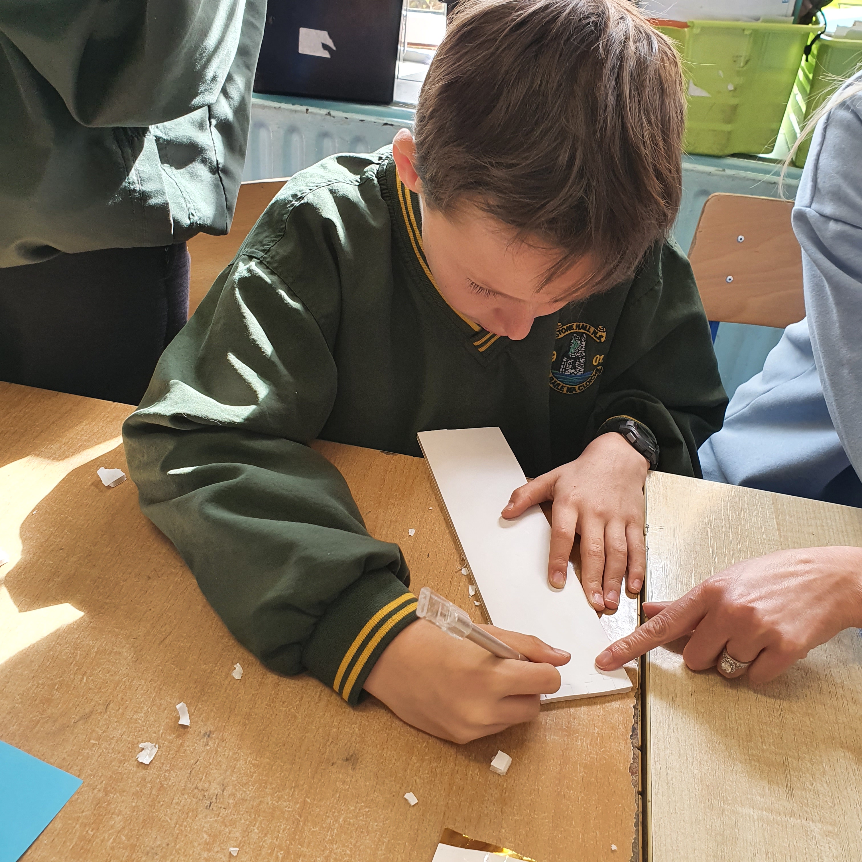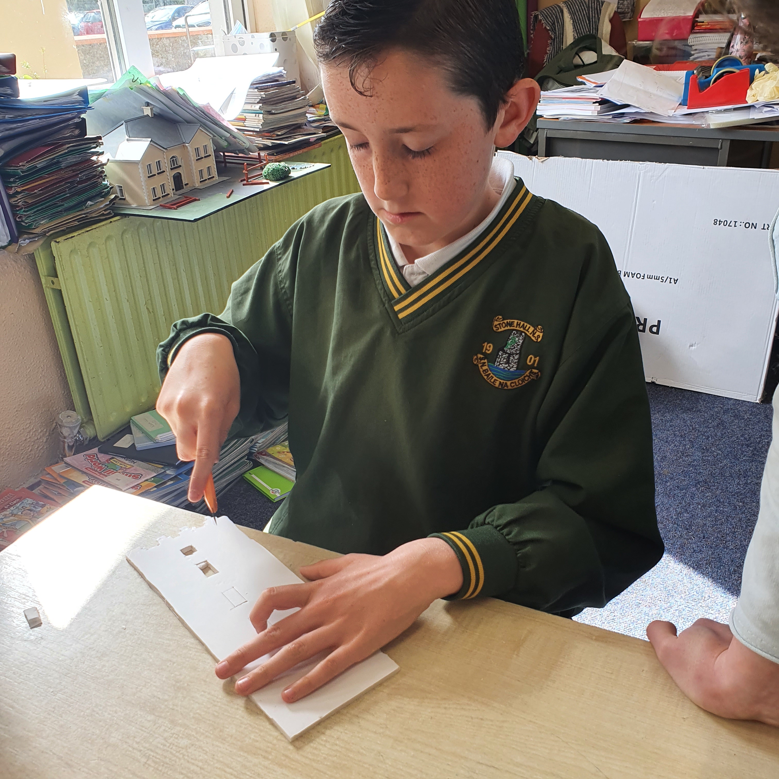 We talked about the significant features on the five castles we chose to make. We spoke about how we would make 3D versions of them. We decided to use a foam card to make the constructions. We found measurements of the walls of the castles from historical sketches. We used these to create scaled sketches for the constructions. We used a scale of 1m:1.5cm. After all the maths were done the classes set about drawing the sketches directed to the card and carving the pieces out with craft knives. This was a slow task in order to get a precise result, especially taking into account area as of the walls which have fallen or broken in parts. Once the walls were cut out, they were glued together. Finally each castle was sprayed with both a grey paint and also a graphite spray to give the texture and ‘stone’ look.